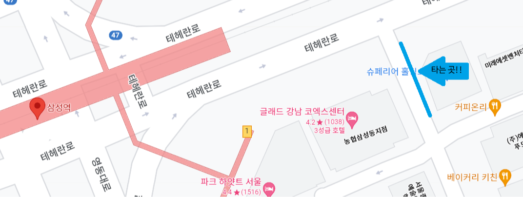 삼성역에서 학원을 갈 때 셔틀버스를 타는 곳은 아래 지도에 표시해 놓은 곳입니다.